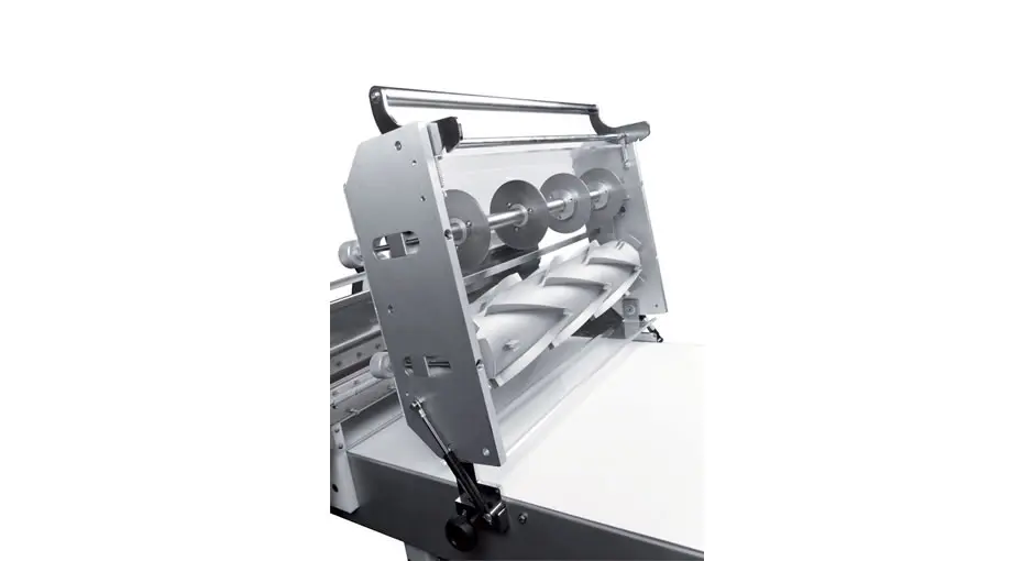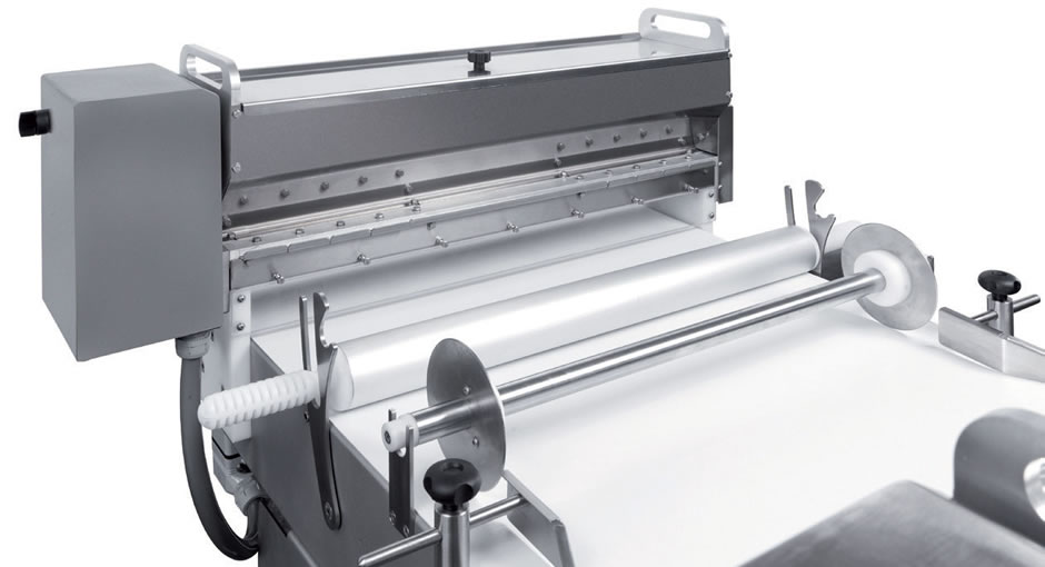 La table est alimentée moyennant le passage de la pâte directement du laminoir ou autre tapis de transfert ou par l'intermédiaire du rouleau à pâtisserie sur lequel est enroulée la pâte.